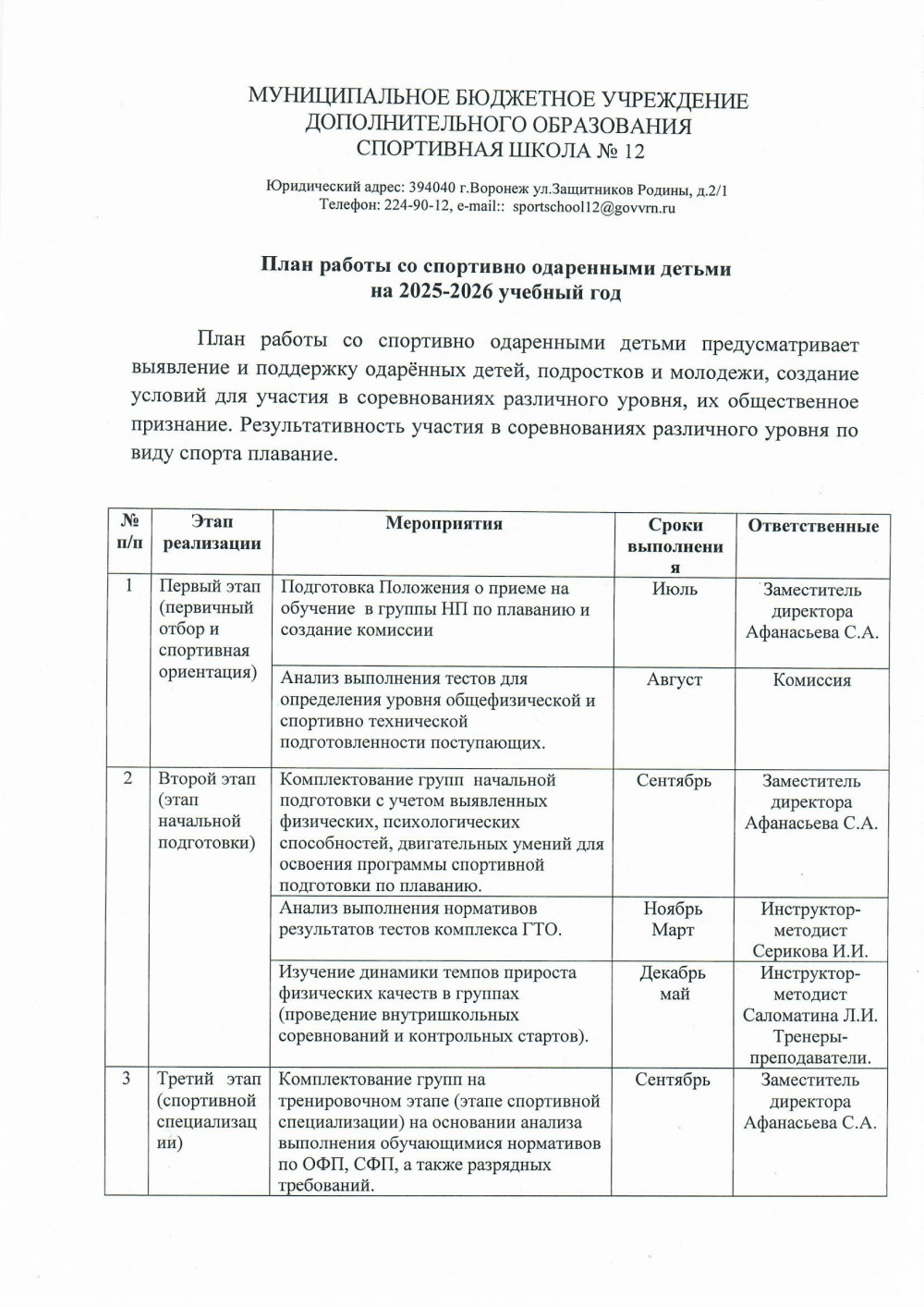 План работы со спортивно одаренными детьми на 2025-2026 уч.год